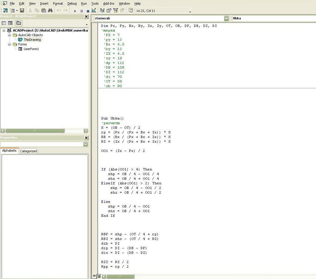 Цветы Опубликовано 28 января, 2009 Поделиться #161 Опубликовано 28 января, 2009 еще у вас есть синтаксические ошибки, просмотрите все внимательнее, кпримеру в программе Sub SaveData() у вас пропущена точка PointR(2) = StrToInt(UserForm1p4.text) должно быть я думаю вот так:PointR(2) = StrToInt(UserForm1.p4.text) если конечно р4 - это кнопочка TextBox которую вы переименовали... В том то и загвозка, если я ставлю точку, то программа выдает ошибку и тогда я удаляю точку то программа успокаивается но все время еще показывает на точки построения К1 - точки координат построения. Буду конечно еще искать ошибки. "Каждый может ошибиться", - сказал ежик, слезая с кактуса. Ссылка на сообщение Поделиться на другие сайты Поделиться