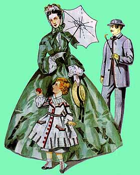 В моде высшего класса, как мне кажется, в то время господствовали испанский стиль, навеянный императрицей Евгенией де Монтихо, испанкой по происхождению, - отсюда многослойность, воланы, болеро, мантильи, кружева и бархат, и арабский стиль, выражавшийся в оформлении нарядов вышитыми сутажем арабесками и ношении бурнусов.