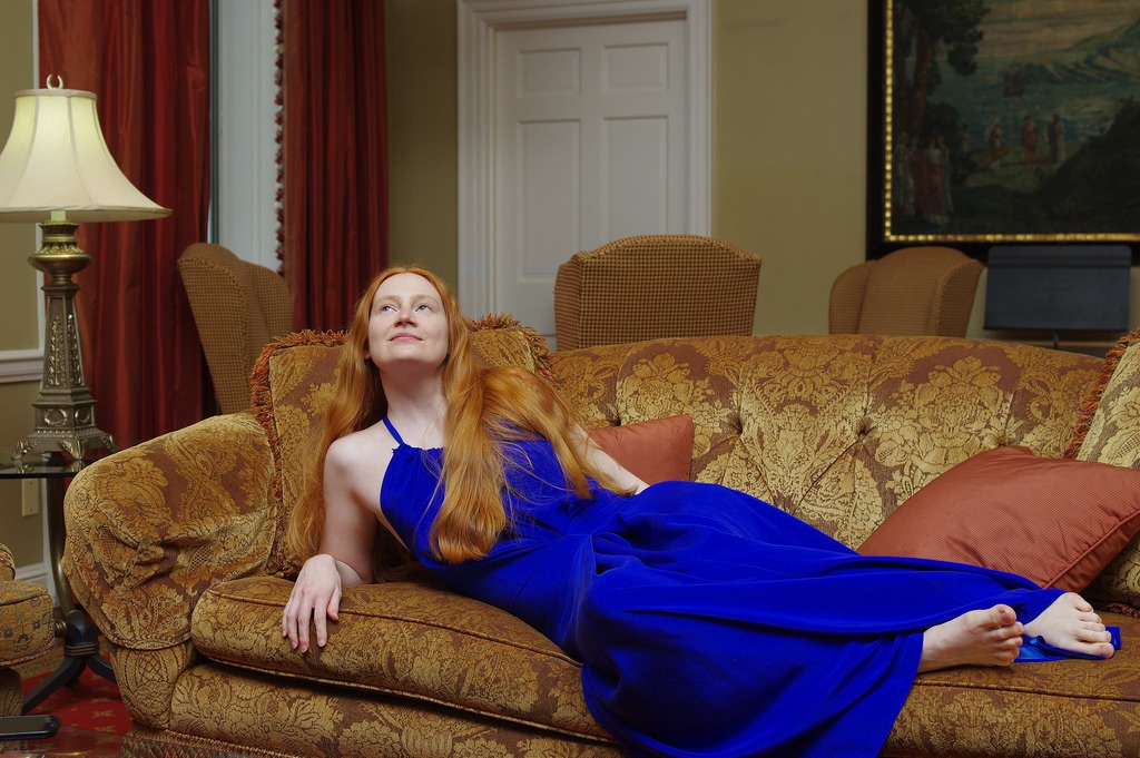 В музее красное платье, если судить по эскизу (складочка горизонтальная у горловины и плечи - реглан сзади и приспущенный спереди) вообще надето задом наперед!