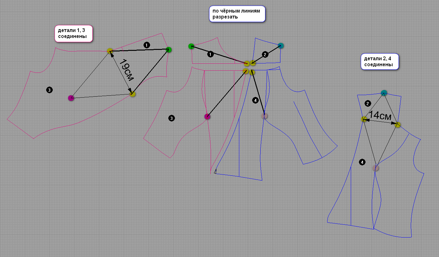 Можно сделать иной перекрут: детали 1 и 2 перекрутить и детали 3 и 4 перекрутить. Я очень долго думала, как??? Потому что у Маши есть бюст и вторым вариантом было бы проще, вернее - оно ляжет лучше...но, поживём - увидим. Пошла разводить...