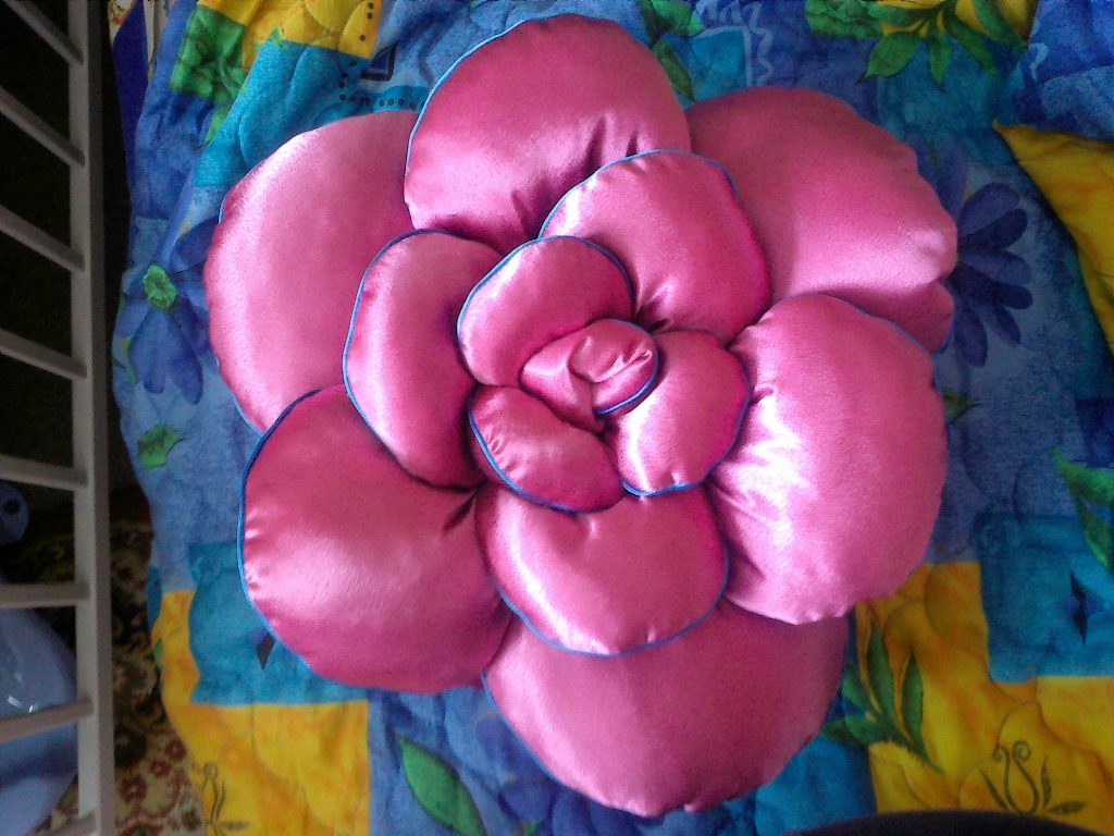 Основа диаметром 50 см – выкраивается, набивается, сшивается. Потом я прострочила внутри окружность примерно 15 см. Незнаю как это обьяснить, вставила рисунки, может поможет. Один лепесток диаметром 20 см скрутила трубочкой и пришила в середину только за верхнюю часть подушки, дальше три лепестка диаметром 15 см тоже пришивала только за верхнюю часть подушки (чтоб с низу не видно было швов), длинна шва примерно 10 см. Потом лепестки диаметром 20 см пришивала по этой простроченой окружности, т.е. захватывала верхнюю и нижнюю часть подушки. Ну и лепестки 25 и 30 см в диаметре опять прихватывала только к верхней части. Господи, как же трудно это объяснить, но думаю поймете, если что задавайте вопросы.