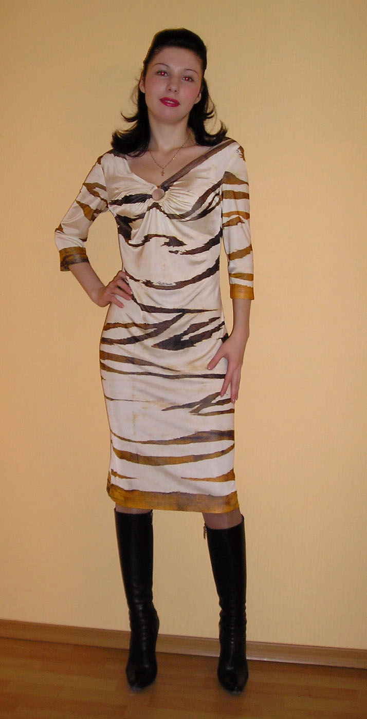 SkY Опубликовано 13 февраля, 2009 Поделиться #163 Опубликовано 13 февраля, 2009 Всем хорошего дня! Выставляю на суд еще несколько работ. 2 платья по выкройке ВОГ. Спасибо за подсказки как работать с этими выкройками Александринке. Белое из шерстяного дерси на подкладке, рукава с ластовицей. На мой взгляд лучше будет смотреться на более плоских фигурах, но для разнообразия носить все равно буду. Со спинкой замучалась (выкройка представляет собой развернутый конус, поэтому только один шов на спинке, соответственно посадить по фигуре проблематично). Коричневое из шелкового трикотажа, но он не тянется. Сама выкройка мне понравилась, но шить подобную ткань тяжеловато. Платье из трикотажа Кавалли, опять же практически не тянется. Но шить его одно удовольствие. Само платье от выкройки до окончания пошива заняло меньше дня. Блуза (выкройка бурда) из шелкового шифона от Кавалли. Все швы (кроме проймы) обработала французским швом. Блузка невесомая. Платье для подруги. Джинс + натуральная кожа. Только когда фотки уже загружала поняла, что надо было фоткать на полу, а то мой манекен совсем не под эту фигуру, но теперь поздно. Девушка с очень женственной фигурой и до бедер оно плотно облегает. Кнопочки еще только поставит. Ссылка на сообщение Поделиться на другие сайты Поделиться