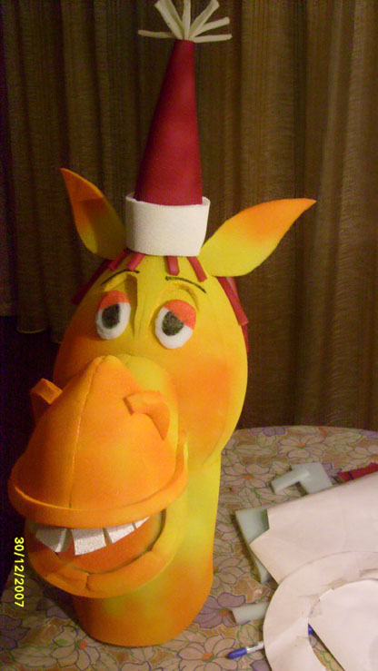 mosha Опубликовано 18 декабря, 2013 Поделиться #3966 Опубликовано 18 декабря, 2013 Всех поздравляю с наступающим новым годом! сделали лошадь стилягу для неонового шоу, ткани подбирал заказчик, они светятся в неоновом фонаре))) Светящийся конь---интересно!А как закреплена голова коня? Как она держится на теле аниматора? Кольцо внутри шеи или ремни наискосок под руками, которые показывал masterkukol? Когда я творила коня Юлия, мне пришлось все возможные варианты креплений продумывать, потому что по ходу спектакля он бегал, танцевал, валялся на спине вверх копытами.Сделала каркас из проволоки, петлей со спины на грудь и выходом на голову через гриву. Из искусственной кожи сшили упряжь, уздечку и подпругу, которая на две пряжки застегивалась впереди, на пузе коня.Окно для обзора я сделала большое, во все лицо и затянула в три ряда сеткой. В этом костюме артист три спектакля в день отрабатывал, да еще и хороводы водил у елки, подарки детям раздавал. Так что необходимо было, чтобы дышать, смотреть и разговаривать он мог через смотровое окно. Ссылка на сообщение Поделиться на другие сайты Поделиться