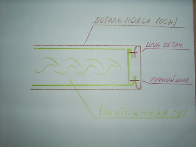 да просто в мужских брюках обычно не обтачной шов , а накладной с закрытым срезом, там на верхнем краю пояса настрачивается внутренняя часть пояса-тесьма, заодно накладным швом этим и перекант закрепляется...а товарищ Stryukhaus спец по мужским брюкам-отсюда и вопрос наверное