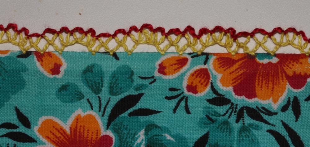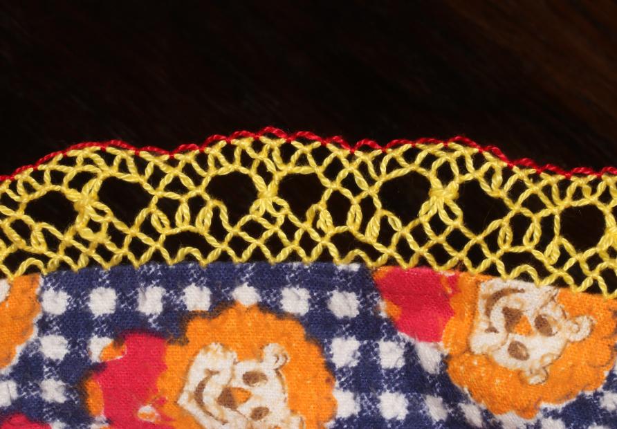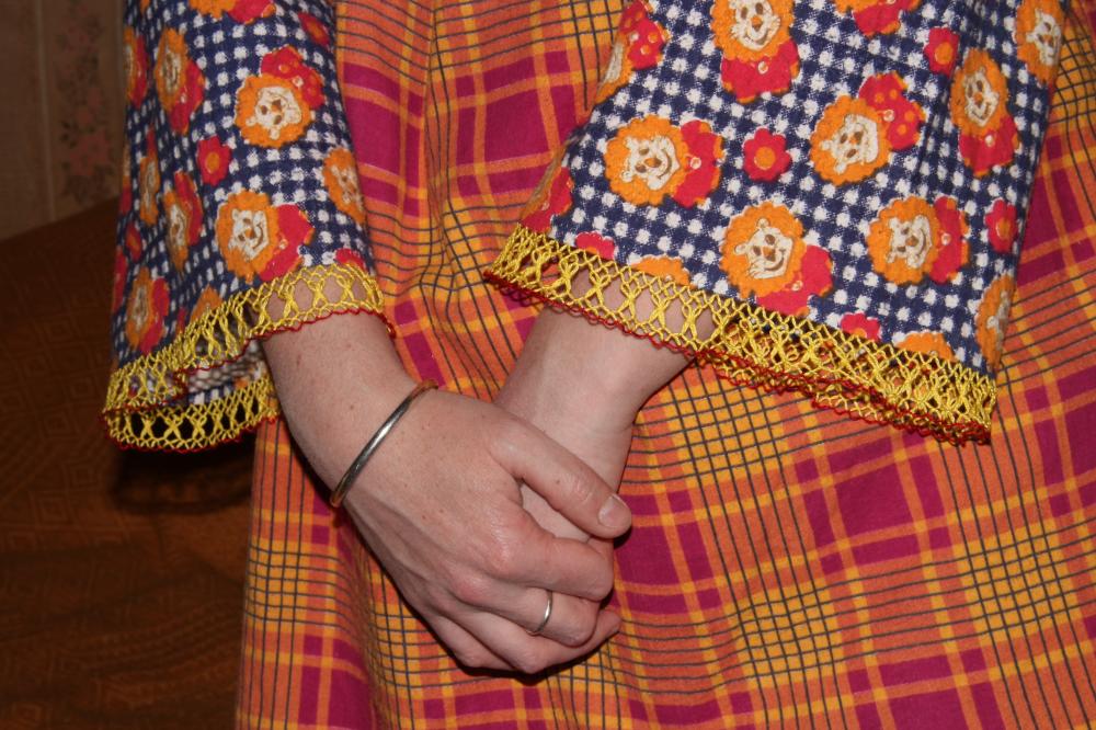 Ещё кружевцо на рукавах домашней рубашки, узор простой - в противовес красочной ткани :) Нитки толстые, раза в 2 толще "ириса". Что за нитки, не знаю - достались от бабушки уже в клубках, х/б для вязания.
