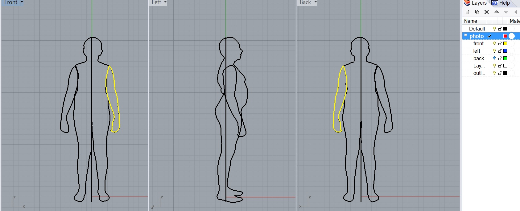 Для показанной фигуры я обвела руки на фронтальных видах отдельно иначе трудно рассмотреть границы туловища и руки.