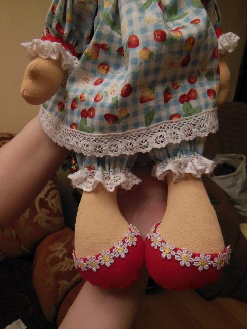 impel Опубликовано 8 января, 2015 Поделиться #241 Опубликовано 8 января, 2015 Не спится нам с Сонечкой)))))решили показаться) Сонечка родилась в подарок моей подруге, сделана по опробованной выкройке из журнала Лена( Наташа-Капутка - ты мой журнальный ангел !!!), хотя меня терзают сомнения, что идею умыкнули из Munecos) Подруга очень долго нарезала круги вокруг моей предыдущей девицы, так что моя совесть уже пнула меня как следует и велела повторить куклу. Что я и сделала. Технология проста, впрочем как всегда) Сшила, набила, покрасила акриловой краской по ткани. Одёжки сшиты из итальянского хлопка, рисунок на нём такой симпатичный, что я сразу же его для кукол и определила. Волосы сделаны и шерсти для валяния, завиты на трубочки для коктейля, пряди предварительно вымочены в мыльном растворе. Два дня экспериментировала )))Туфельки сшиты из фетра. Для лучшего облегания вымочены и растянуты по форме ноги. Это с горя -был маловаты и плохо натягивались, вот инженерная мысль и заработала))))В руках пока ничего -будут два аксессуара -рождественский пряник и сердечко(по заказу мамочки))) Фото с оной будет позже, пока все сонные и объетые после праздников. Добавлю обязательно. Ну и немного подробностей С фоточками замучилась -у меня новая операционка и пришлось обрабатывать тем, что было в наличии. Ещё не все программы установлены, так что за качество заранее извиняюсь. Заходите в гости Сделано с любовью...If you can't have the best, make the best of what you have Ссылка на сообщение Поделиться на другие сайты Поделиться