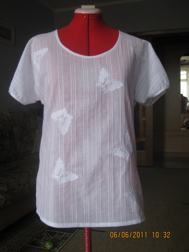 А у меня сшилась распашонка из очень тонкого х/б,впервые делала вышивку на одежде,вышила бабочек. Можно критиковать.