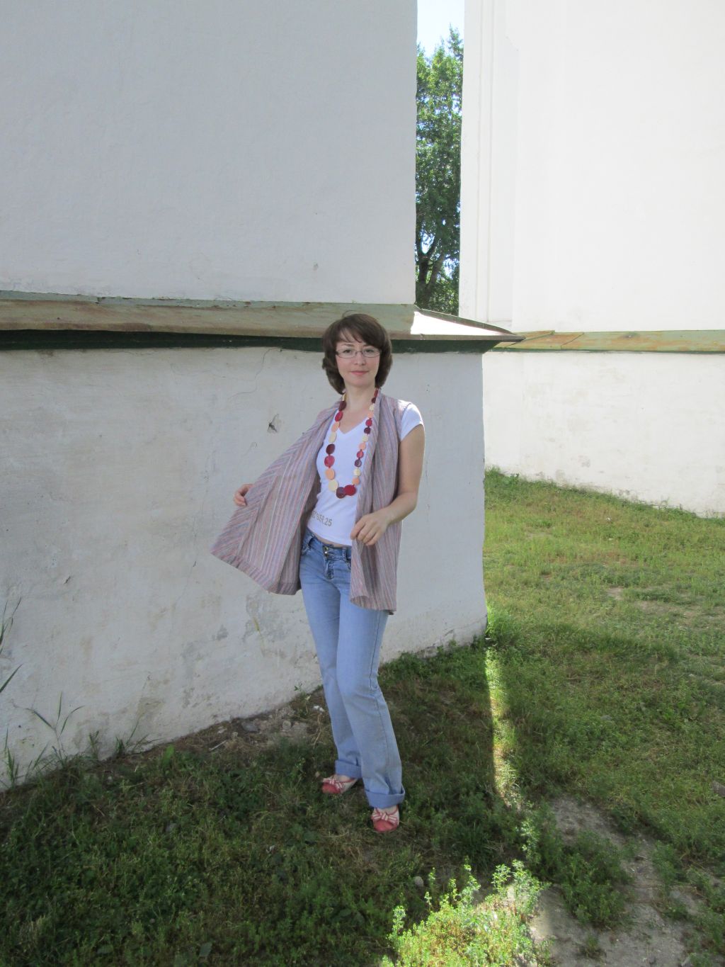 Жилет по БМ 4/2012. Ткань - лен, для этой модели оказался грубоват... думала, что после стирки ткань будет легкой (как обещали в магазине), ан нет... Пришлось переделать кое-что - боковые швы сделала прямыми, длину сзади убрала, т.к. напоминала себе кузнечика в этом жилете :)