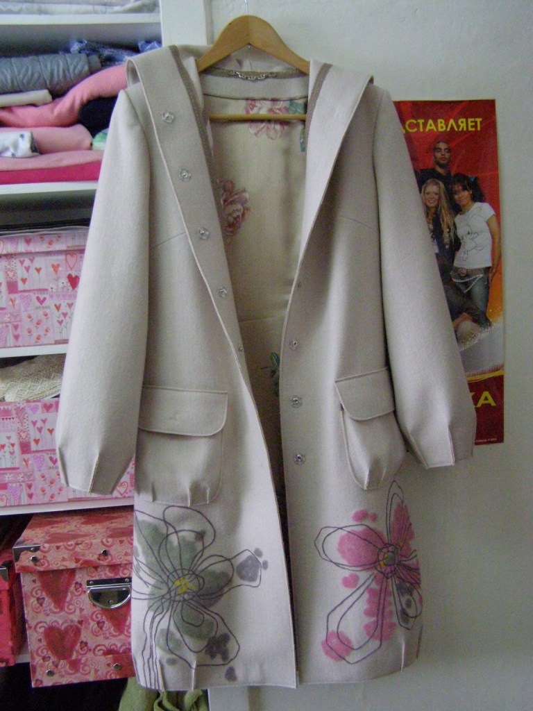 Захотела моя дочерь пальто, посмотрели все драпы во всех магазинах, ничего не понравилось, или тёткинские или слишком загруженные декором на грани с безвкусицей, купили просто хороший драп и решили сами порисовать. Вот несколько картинок, для рассматривания.
