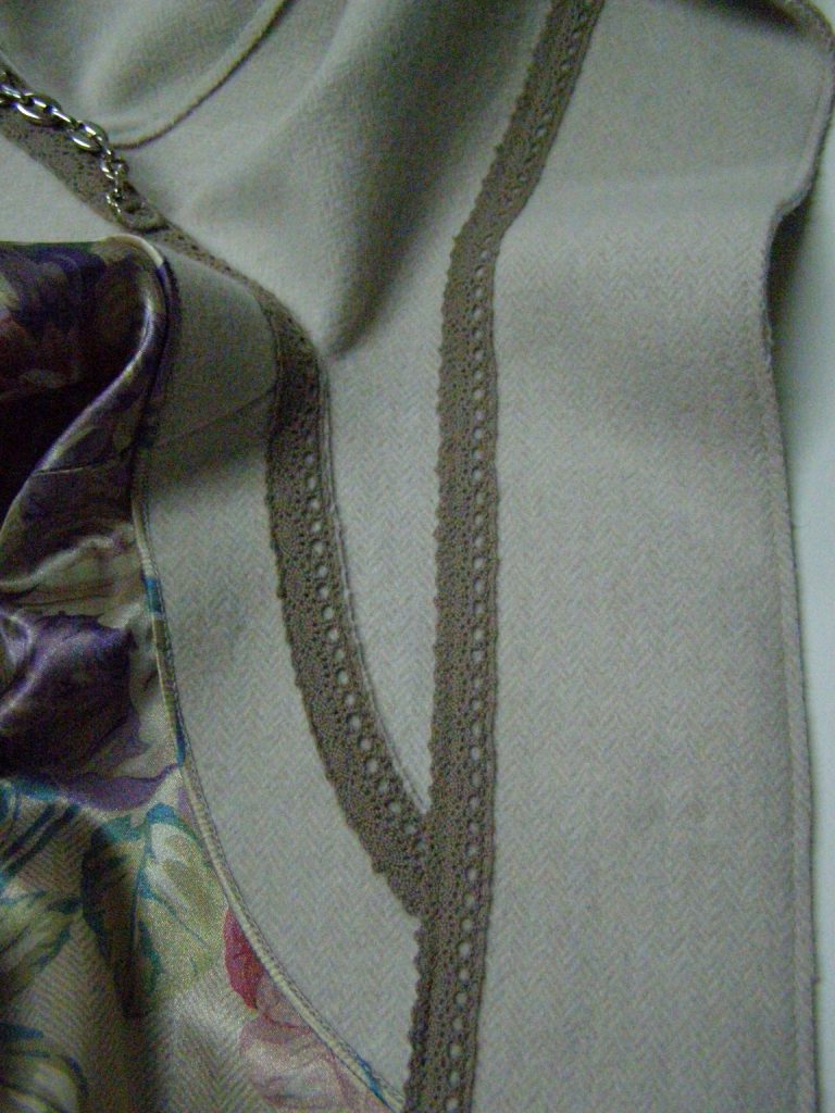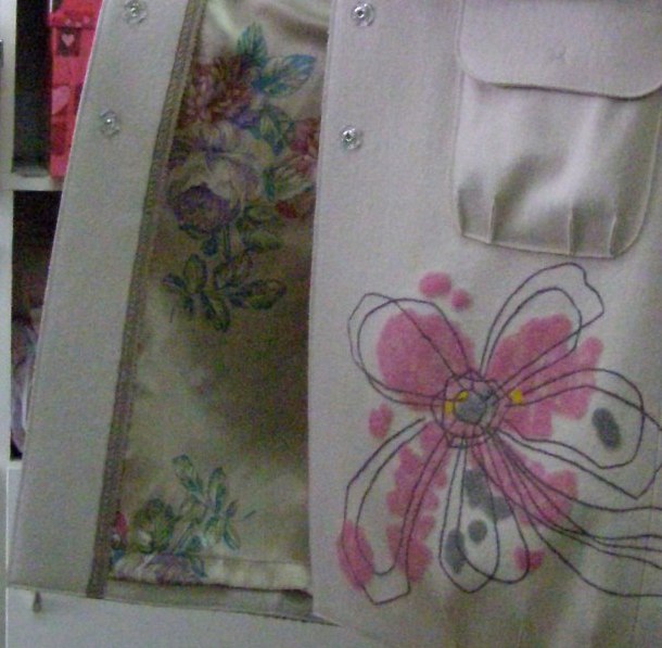 Рисовала, конечно, шерстью, на фелт машине, просто забыла слово порисовали в кавычках написать, вот и ввела народ в заблуждение. А цветочки на подкладе вполне нормальные может быть розочки, но нам же подавай дурацкие, поэтому с подклада взяли только сочетание цветов. К пальто ещё будет шарф из той же пряжи что использовала в рисунках. Швы открытые все, кроме боковых-плечевых, да и что рассказывать, на фото всё видно:)