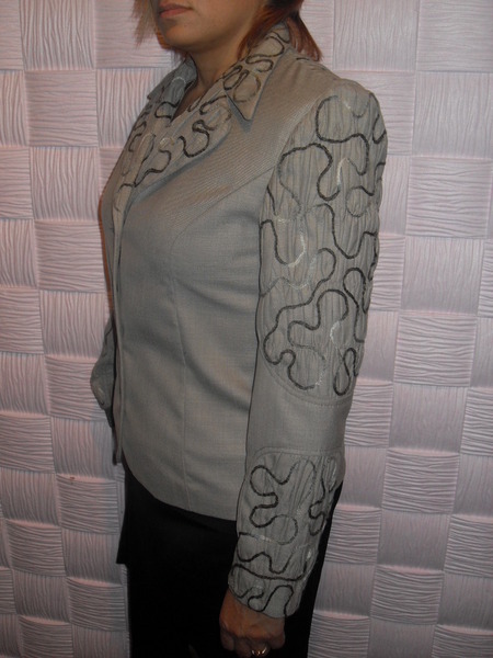 я пришила шерстяную (только ее нашла в тон к ткани) нить машинной строчкой. полочка, спинка и рукава хаотично, а вот воротник и лацканы старалась соблюсти симметрию...вроде получилось.