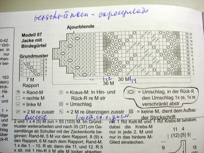 Luciana Опубликовано 15 июня, 2006 Автор Поделиться #2 Опубликовано 15 июня, 2006 MarucjaЭто взято из Интернета, с качеством уже ничего не поделаешь. Но вот текст условных обозначений, мне только это и нужно:1) Hinr rechte M, Rückr linke M2) Hinr linke M, Rückr rechte M3) in Rückr: 2 Umschläge arbeiten, dann 1 M links str4) 6 M mit einer Hilfnadel vor die Arbeit legen, die folgenden 2 M rechts str, dabei die Umschläge der Vorreihe fallen lassen und die M lang ziehen, dann von der Hilfnadel 2 M rechts, 2 M links und 2 M rechts str5) 2 M mit neiner Hilfadel hinter die Arbeit legen, dabei die Umschläge der Vorreihe fallen lassen und die M lang ziehen, über die foldenden 6 M 2 M rechta, 2 M links und 2 M rechts str, dann die M der Hilfadel reshts str Спасибо. Ссылка на сообщение Поделиться на другие сайты Поделиться