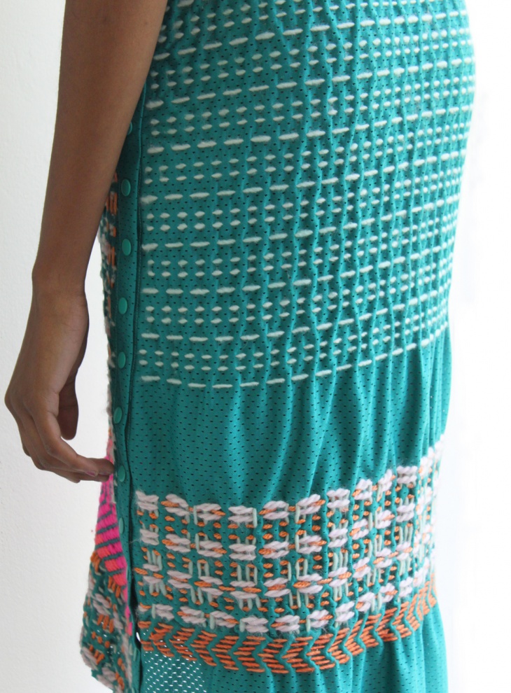 болотное платье: отдельно выкроены и сшиты верх и юбка, затем швом вперед иголку переходящим в тамбурный шов сделаны петли, потом они собраны на спицы и вывязан воротник-труба. Таким же способом пришита-привязана юбка к лифу, только вверху юбки тамбурный шов переходящий в шов вперед иголку.