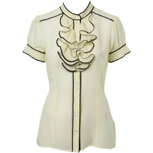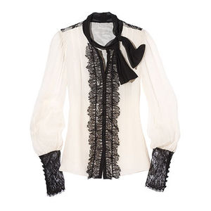 Мое ИМХО - блузка перегружена, кружево на рукавах несколько лишнее. Здесь используется довольно контрастное сочетание однотонной ткани с полоской, да еще скроенной в разных направлениях.