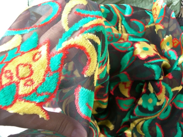 4. Сочетая ткани, можем получить новые цвета - например наложением черной сетки с вышивкой на ярко-алый шелк получим малиновый тон и т.п.